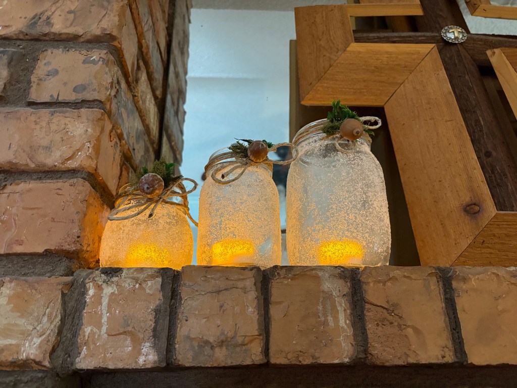So I frosted new mason jars with modge podge and Epsom salts and decorated the rims with natural materials and put flameless tea lights inside.