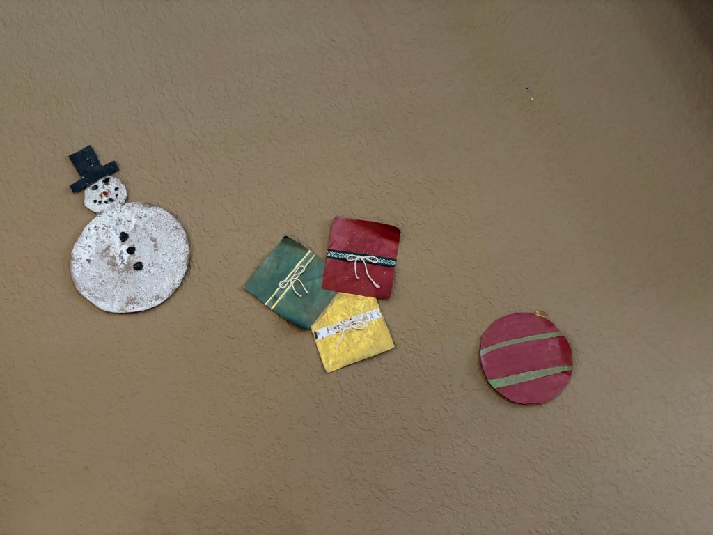Next, I made decoration for the blank wall space next to his tv. These were created from grocery sacks and hand painted, glittered, or twinned, one even has the combo of Epsom salts and flour to create the “snow” on the snowman. By some miracle, his carrot tip of a nose stayed glued on, even though I didn’t give it much time to adhere.
