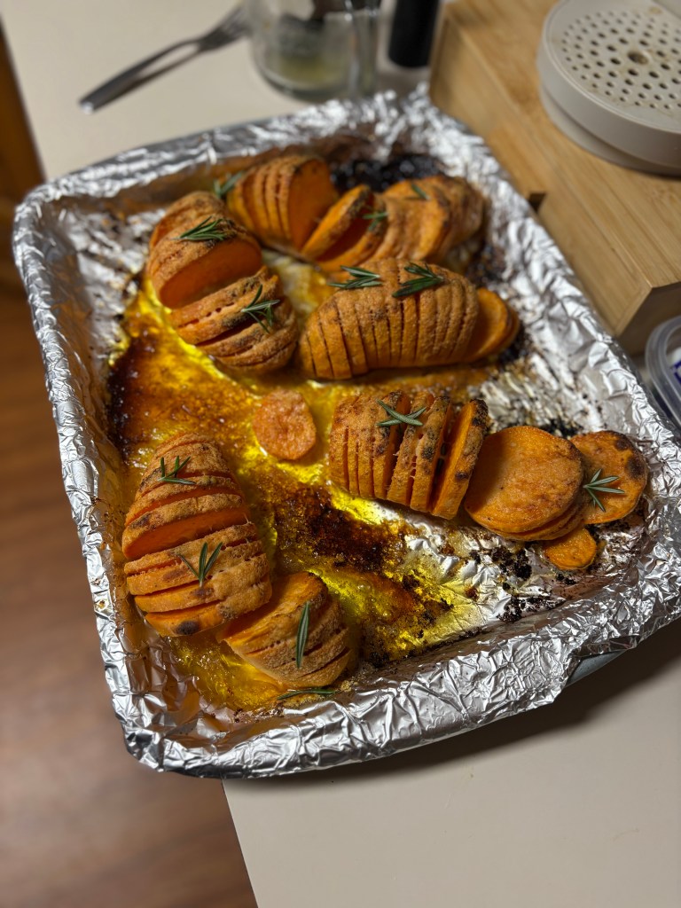If I ever do these again, I’m going with the butter, sugar, cinnamon recipe. I think it would be more tasty. I had a hard time with garlic on a sweet potato but the parm made a nice crust on top.