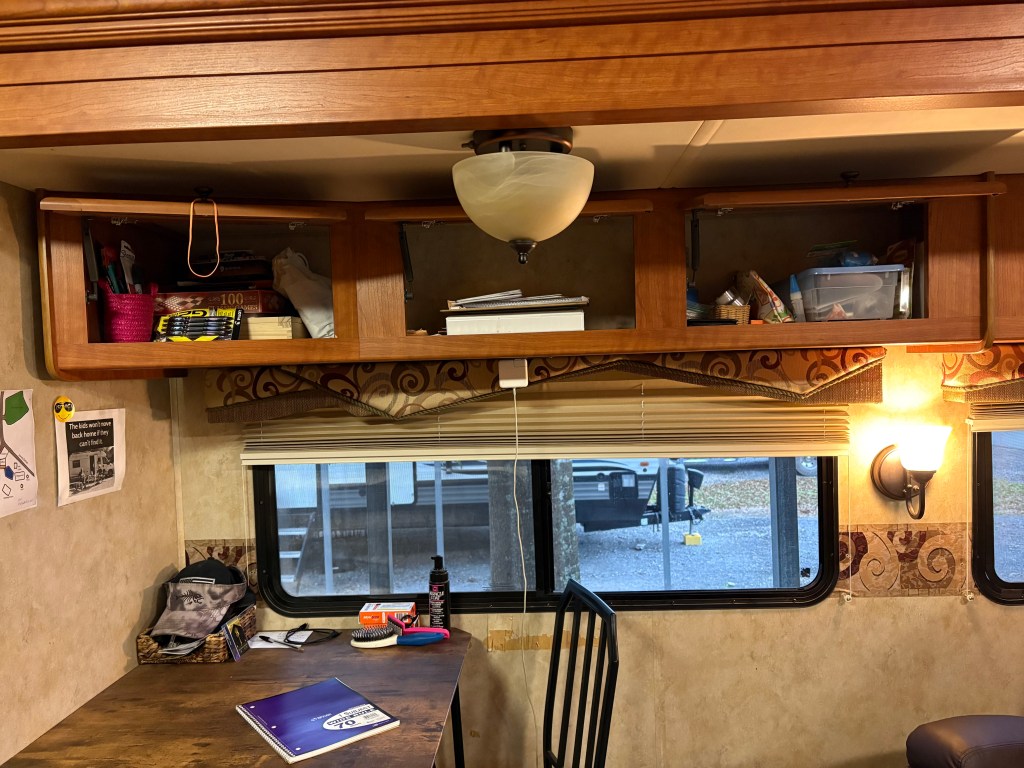 Today I organized the overhead cabinets and the pantry. I’m tired of not knowing what canned goods we have, so I moved them down to the slide-out drawers. It really holds a lot more food than you’d think! We have enough storage for everything we need and that’s a blessing. I don’t know how people in smaller RVs do it, but everyone finds their own tips and tricks I’m sure.