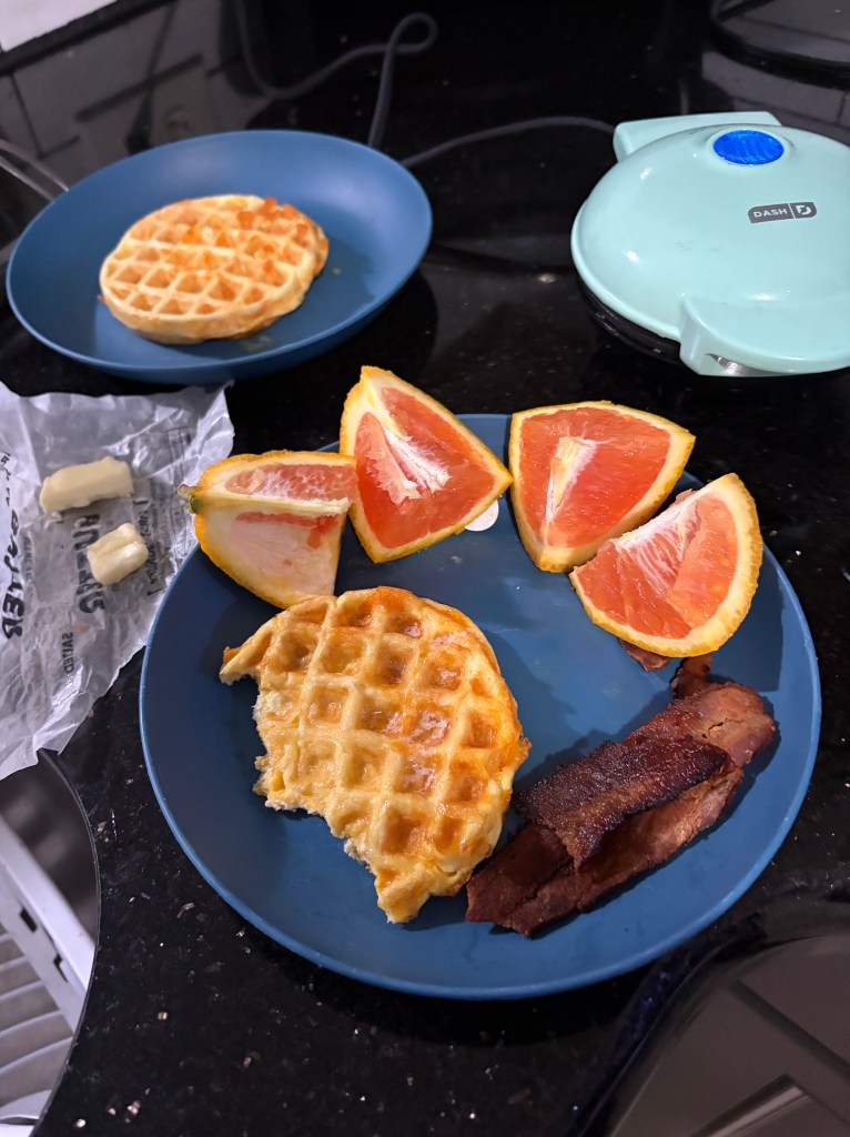 I was so happy that I brought my Dash waffle iron, so I went and got lots of grated cheeses and made some chaffles. I have to get off bread and sugar again and these will help me do that. Neighbor Jim visits me sometimes and last time he brought me some ivy cuttings! He’s the sweetest!