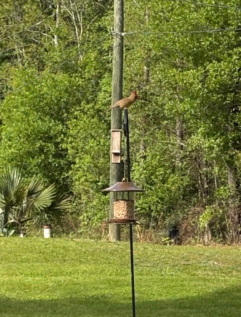 I have be n working in the yard setting things up so I can watch birds and my spinner. I finally saw a female cardinal on my feeder! Then the squirrels found it and they ate all the birdseed. 😌