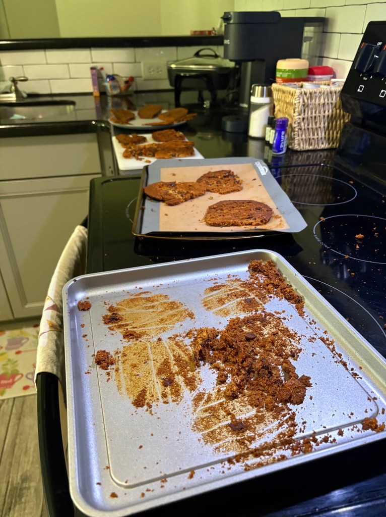 Since I have you, I’ll share what I’ve been wanting to blog about…my messes. This week and last, I’ve made some doozies! This here was a batch of choco-chip cookies gone horribly wrong. Note to self: Honey will NOT sub for agave syrup.